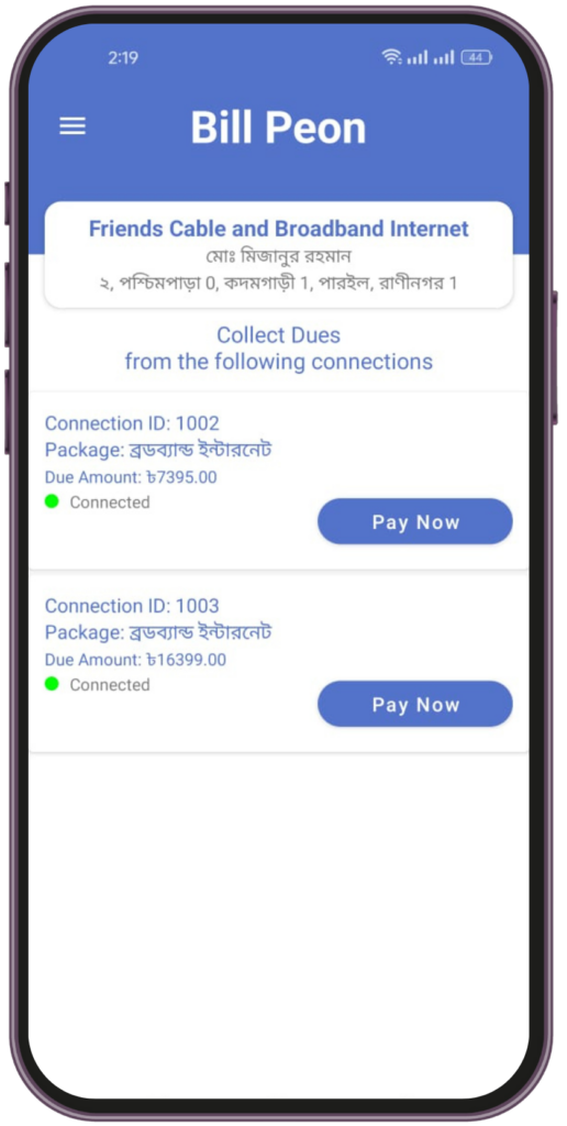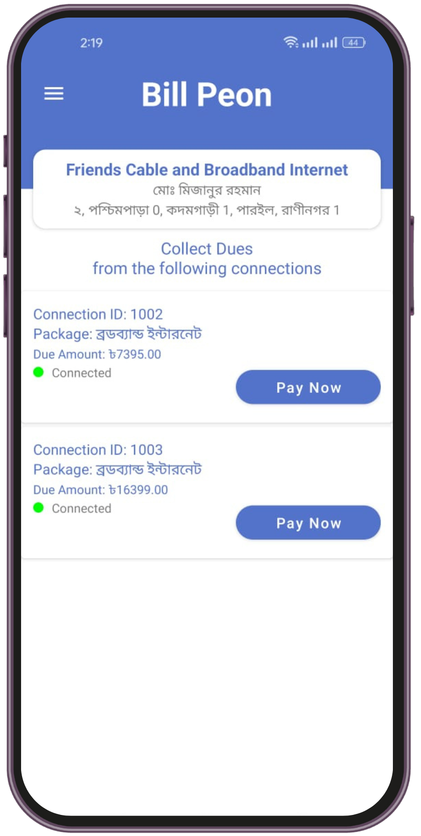 সকল প্রকার হিসাবের ঝামেলা থেকে মুক্তি পেতে এবং নির্বিঘ্নে ব্যবসা চালিয়ে যেতে ব্যবহার করুন বিল পিয়ন সফটওয়্যার। বিল পিয়ন সফটওয়্যার ব্যবহার করে আপনি পাবেন বকেয়া ও কালেকশন এর সঠিক হিসাব। থাকবেনা কোন অনিয়মের সু্যোগ এবং ব্যবসা চলে আসবে আপনার হাতের মুঠোয়।